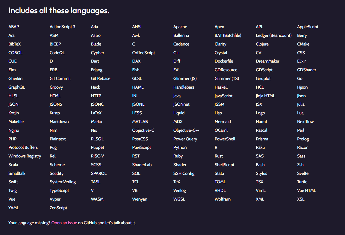 코드 블록 프로에서 지원하는 프로그램 언어는 "ABAP, ActionScript 3, Ada, ANSI, Apache, Apex, APL, AppleScript, Ara, ASM, Astro, Awk, Ballerina, BAT (Batchfile), Ledger (Beancount), Berry, BibTeX, BICEP, Blade, C, Cadence, Clarity, Clojure, CMake, COBOL, CodeQL, Cypher, CoffeeScript, C++, Crystal, C#, CSS, CUE, D, Dart, DAX, Diff, Dockerfile, DreamMaker, Elixir, Elm, ERB, Erlang, Fish, F#, GDResource, GDScript, GDShader, Gherkin, Git Commit, Git Rebase, GLSL, Glimmer (JS), Glimmer (TS), Gnuplot, Go, GraphQL, Groovy, Hack, HAML, Handlebars, Haskell, HCL, Hjson, HLSL, HTML, HTTP, INI, Java, JavaScript, Jinja HTML, Jison, JSON, JSON5, JSONC, JSONL, JSONnet, JSSM, JSX, Julia, Kotlin, Kusto, LaTeX, LESS, Liquid, Lisp, Logo, Lua, Makefile, Markdown, Marko, MATLAB, MDX, Mermaid, Narrat, Nextflow, Nginx, Nim, Nix, Objective-C, Objective-C++, OCaml, Pascal, Perl, PHP, Plaintext, PLSQL, PostCSS, Power Query, PowerShell, Prisma, Prolog, Protocol Buffers, Pug, Puppet, PureScript, Python, R, Raku, Razor, Windows Registry, Rel, RISC-V, RST, Ruby, Rust, SAS, Sass, Scala, Scheme, SCSS, ShaderLab, Shader, ShellScript, Bash, Zsh, Smalltalk, Solidity, SPARQL, SQL, SSH Config, Stata, Stylus, Svelte, Swift, SystemVerilog, TASL, TCL, TeX, TOML, TSX, Turtle, Twig, TypeScript, V, VB, Verilog, VHDL, VimL, Vue HTML, Vue, Vyper, WASM, Wenyan, WGSL, Wolfram, XML, XSL, YAML, ZenScript" 등 거의 모든 프로그램 언어를 지원합니다.