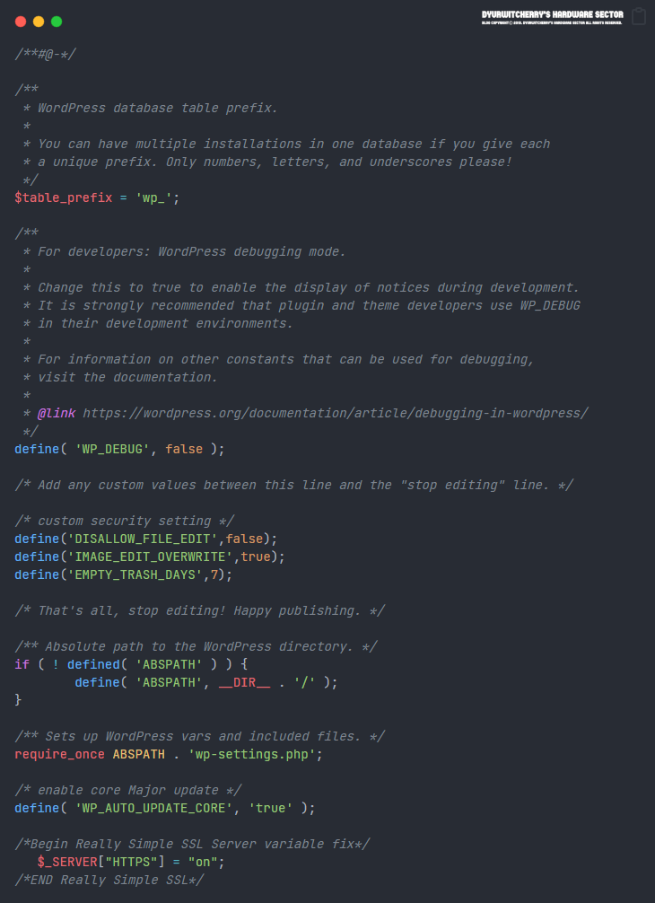 워드프레스에 코드 블록 삽입 플러그인으로 'Code Block Pro'를 설치하고 'ONE DARK PRO' 테마를 적용한 다음, 'wp-config.php' 파일 중 일부를 테스트 한 화면을 캡처한 것으로, macOS theme에 우측에는 복사 버튼이 추가되어 있습니다. 참고로, 코드 블록 프로 무료 버전에서도 버튼과 라인 설정, 헤더와 푸터 타입, 폰트 스타일과 높이 설정, 기타 옵션을 적용할 수 있으며, 고급 메뉴의 추가 CSS 클래스를 이용하여 공백으로 다중 클래스를 분리할 수 있는데, 테마 옵션 하단의 'Get 25+ more themes here (새탭에서 열기)' 링크를 클릭하여 라이선스를 구매하여 추가 기능을 이용 할 수 있습니다.