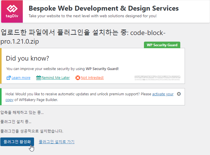 코드 블록 프로 플러그인 '*.zip' 파일을 업로드 한 후 '지금 설치' 버튼을 누르면, 바로 '압축을 해제하고 있는 중...'과 함께 '플러그인 설치 중...', 그리고 '플러스인을 성공적으로 설치했습니다.' 메시지가 나타나며, '플러그인 활성화' 버튼을 눌러 활성화 한 다음, WordPress 블록 에디터에서 Code Block을 추가 할 수 있습니다.
