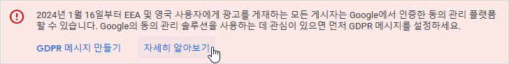 구글 애드센스 대시 보드에는 "2024년 1월 16일부터 EEA 및 영국 사용자에게 광고를 게재하는 모든 게시자는 Google에서 인증한 동의 관리 플랫폼(CMP)을 사용해야 합니다. Google의 자체 동의 관리 솔루션을 포함하여 Google에서 인증한 CMP 이면 어떤 것이든 이 목적으로 사용할 수 있습니다. Google의 동의 관리 솔루션을 사용하는 데 관심이 있으면 먼저 GDPR 메시지를 설정하세요."의 개인 정보 보호 메시지가 나타나며, '자세히 알아보기'를 클릭하여 제반 내용을 확인할 수 있습니다.