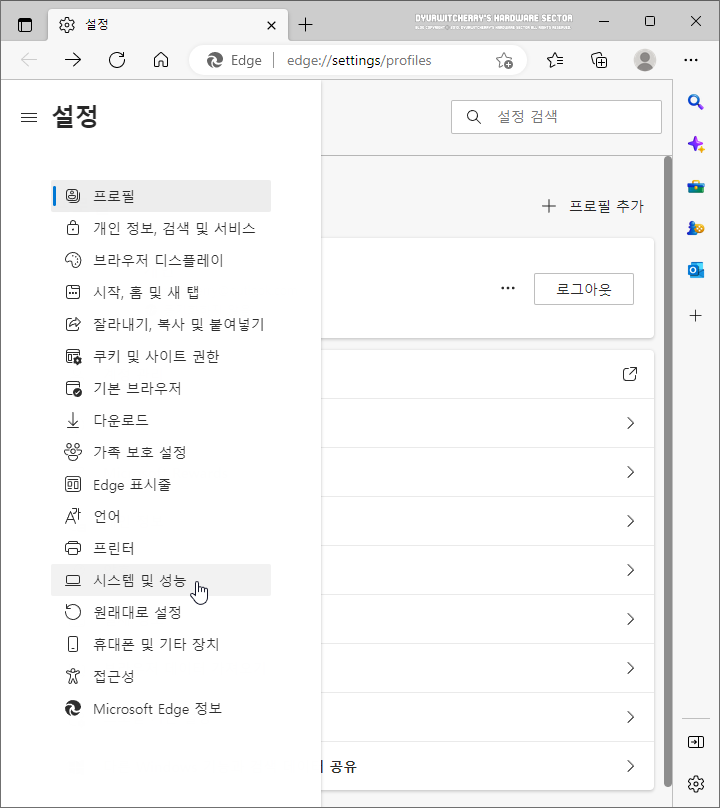 Microsoft Edge Browser 설정 창이 새 탭 또는 새 창으로 활성화 되면, 좌측 메뉴 하단의 '시스템 및 성능' 항목을 클릭합니다. 참고로 PC 환경 기준으로 반응형 스킨에 본문과 우측 사이드 바 등 2단으로 구성 된 티스토리 블로그 포스팅 시 가독성 향상을 위해 설정 창을 축소하여 화면 캡처한 것으로, 모니터 해상도 '1366 × 768' WXGA 이상 '1920 × 1080' FHD 등의 전체 화면에서는 왼쪽의 설정 메뉴와 오른쪽의 세부 항목이 함께 표시됩니다.