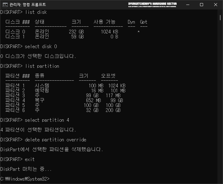 DISKPART에서 Windows 11 복구 파티션을 삭제하고 DISKPART>에 'exit' 명령어를 입력한 다음 엔터 키를 누르면, ' DiskPart 마치는 중...' 메시지가 출력되고 'C:\Winodws\System32>' 경로로 이동 되어 다른 작업을 하거나 명령 프롬프트 앱의 '×' 닫기 버튼을 클릭하여 CMD 창을 종료하면 됩니다.