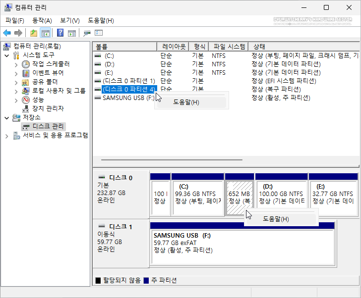 컴퓨터 관리 창이 활성화 되면 좌측 트리 메뉴에서 '저장소 - 디스크 관리'를 선택 합니다. 디스크 관리의 우측 세부 항목의 탐색기 창에 시스템에 연결되어 있는 디스크 목록을 확인할 수 있는데, 포스팅의 캡처 이미지에서는 C: 드라이브 다음 영역에 652MB공간 '디스크 0 파티션 4'가 복구 파티션 영역으로 지정되어 있어 볼륨 확장이 되지 않고, 복구 파티션에 마우스 오른쪽 버튼을 누르면 '도움말(H)' 항목만 확인할 수 있습니다.