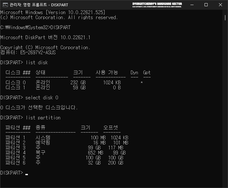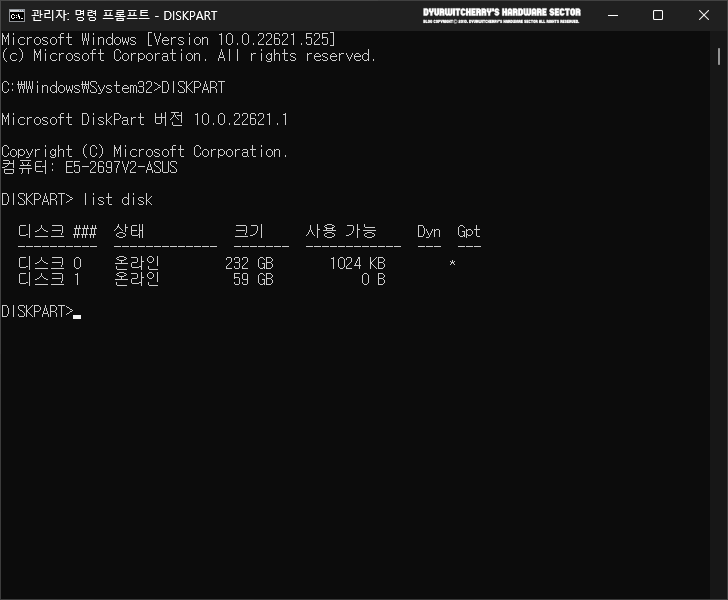 윈도우 파워쉘이나 명령 프롬프트 앱을 관리자 권한으로 실행한 후 CMD 창에 'DISKPART'를 입력하고, 엔터 키를 누르면 'Microsoft DiskPart 버전 10.0.22621.1'과 컴퓨터 이름 'ex. E5-2697v2' 등이 표시 되면서 디스크파트가 실행 됩니다.