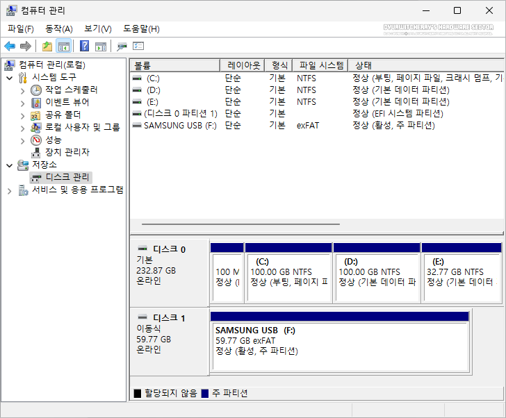 윈도우 11 복구 파티션을 삭제하고, 볼륨 확장을 선택하여 할당되지 않은 공간을 'C: 드라이브'에 추가하면 '컴퓨터 관리 - 저장소 - 디스크 관리'의 '디스크 0' 항목에 '할당되지 않은 공간'이 없는 것을 확인할 수 있으며, 파티션이 분할되어 있는 'D: 드라이브' 또는 'E: 드라이브' 영역을 삭제하거나 확장 또는 축소 등의 작업을 할 수 있습니다. 참고로, DISKPART를 실행하여 복구 파티션을 삭제하는 방법은 Windows 11 이하 Windows 10과 8.1, 8과 7 등에서도 동일하게 적용할 수 있습니다.